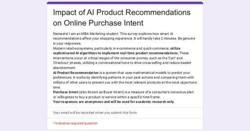 I am conducting research on the “Human-AI Interaction” shift in modern shopping, where apps now act as “helpful friends” with nudges like “You might love this!” or “Did you forget something?”. I am aiming for a global sample size of 300+ participants to ensure the data is statistically significant for my final thesis. If you are 18+ and have ever used an e-commerce or quick-commerce app, please take 2 minutes to share your perspective. Your input is crucial in helping me reach this milestone! Survey Link: https://forms.gle/1U1fMaUtNuM8Fy6h6 submitted by /u/greathardy