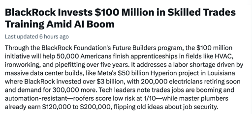 eifachposteMB to AI (Reddit RSS)English · 10 hours agoSkilled trades in demand due to AI according to Blackrock. This is why I ditched my software engineering job to trucking delivering welding equipment partsi.redd.itimagemessage-square0linkfedilinkarrow-up11file-text