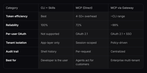 Building a developer tool where the user is the developer? Use CLI + Skills. Add an 800-token skill file. You get the best efficiency in the benchmark, and you don’t need per-user auth because you are the user. Building a product where agents act on behalf of customers? You need MCP’s authorization model. But don’t connect directly to 43-tool servers — the cost and reliability numbers are real. Building multi-tenant enterprise infrastructure? You need both: MCP’s auth model for governance, plus a gateway that solves the efficiency and reliability problems the benchmark exposed. The gateway architecture: CLI efficiency + MCP authorization Schema filtering. Instead of injecting all 43 GitHub tool schemas, a gateway returns only the 2–3 tools relevant to the current request. MCP drops from 44,000 tokens to ~3,000 — approaching CLI efficiency. ~90% token reduction. Connection pooling. Instead of each agent session establishing its own TCP connection to every MCP server, a gateway maintains persistent connections and absorbs transient failures. 28% failure rate → ~1%. Auth centralization. Instead of each agent managing OAuth tokens per service, the gateway handles token refresh, scope enforcement, and audit logging in one place. Single auth boundary per tenant. Source: MCP vs CLI Benchmarking/Report — published March 11, 2026, based on 75 benchmark runs comparing CLI and MCP on identical tasks using Claude Sonnet 4. submitted by /u/nishant_growthromeo