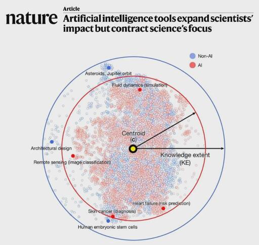 Can Al truly supercharge science if it’s actually making our field of vision narrower? The academic world is currently obsessed with Al-driven discovery. But a massive new study published in Nature Magazine the largest analysis of its kind, reveals a startling paradox: while Al is a career rocket ship for individual scientists, it might be shrinking the horizon of science itself. The data shows a clear divide between the winners and the laggards. Scientists who embrace Al (from early machine learning to modern LLMs) are reaching the top at record speeds. The scale of the Al advantage: 3x more papers published compared to non-Al peers. 5x more citations, showing massive professional influence. Faster promotion to leadership roles and prestigious positions. But there is a hidden cost to this efficiency. As you can see in the visualization of Knowledge Extent (KE), Al-driven research (the red zone) tends to cluster around the centroid the safe, well-trodden middle. While individual careers expand, the collective focus of science is actually contracting. While we need the speed of Al to process vast amounts of data, we also need the blue 🔵 explorers the scientists who venture into the fringes of the unknown, away from the crowded problems. Al is excellent at finding patterns in what we already know, but it struggles to build the unexpected bridges that connect distant fields. The most complex breakthroughs often come from the messy, interconnected outer circles of thought, not just the optimized center submitted by /u/tiguidoio