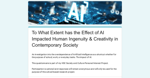 Hello everyone. This is a questionnaire regarding your interaction and opinion on Al. It is an investigation into the overdependence of Artificial Intelligence as a “shortcut” from school, work, or everyday tasks and it’s impact on human cognition, ingenuity and creativity. This questionnaire is part of my HSC Society and Culture Personal Interest Project. Participation is optional and responses will remain anonymous and will only be used for the purpose of this school-based project. Thank you very much for your cooperation. submitted by /u/ShoddyEntertainer456