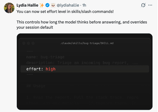 arrow-up11imagenow you can set effort level in skills/slash commandsi.redd.iteifachposteMB to AI (Reddit RSS)English · 2 hours agomessage-square0linkfedilinkfile-text