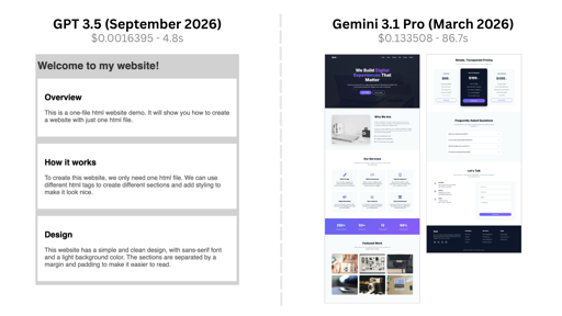 I sent the same prompt to OpenAI’s ChatGPT (GPT‑3.5, September 2023) and Google’s Gemini (3.1 Pro, March 2026). Here’s the prompt I used: “Please generate a comprehensive single-file HTML website demo with multiple sections and a polished, visually appealing design.” Gemini cost 81× more than GPT‑3.5 and took 20× longer , but it produced a large website with multiple sections, icons, forms, and images. GPT‑3.5 only wrote a few lines of HTML with white text boxes. The difference is crazy. I don’t remember ChatGPT being that bad. That’s why I tried this: I wanted to see how much AI really improved. When do you think we’ll reach AGI or ASI? If ever? submitted by /u/Embarrassed_Draw_195