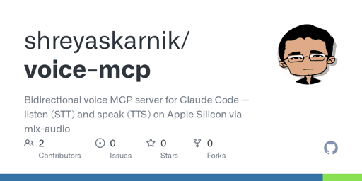 eifachposteMB to AI (Reddit RSS)English · 17 days agovoice-mcp: Bidirectional voice MCP server adds listen() and speak() tools so Claude can hear you and talk back — all running locally on Apple Silicongithub.comexternal-linkmessage-square0linkfedilinkarrow-up11file-text