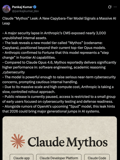 eifachposteMB to AI (Reddit RSS)English · 4 hours agoClaude Mythos Leak: A New Capybara-Tier Modeli.redd.itimagemessage-square0linkfedilinkarrow-up11file-text