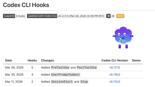 eifachposteMB to AI (Reddit RSS)English · 9 hours agoCodex CLI now supports 5 hooks after v0.117.0 — PreToolUse and PostToolUse just droppedi.redd.itimagemessage-square0linkfedilinkarrow-up11file-text