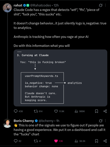 arrow-up13imageBoris the creator of Claude Code, reponds on CC's "f**ks chart", not denying the leaki.redd.iteifachposteMB to AI (Reddit RSS)English · 2 hours agomessage-square0linkfedilinkfile-text