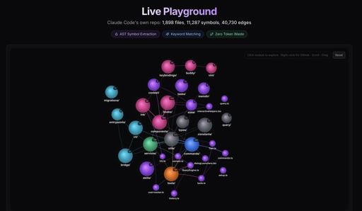 I was building this MCP tool - Open-source Tool. It indexes your repo and on query, the indexed graph provides relevant files! Playground: graperoot.dev/playground Recently, Claude code files were leaked and i tried to create how those ~1900 files are connected and looks like, that’s when i used my algorithm, i got this beautiful graph and you can ask the query too, it will show top relevant files according to query. If you’re interested to save 50-70% tokens, use my MCP tool : https://github.com/kunal12203/Codex-CLI-Compact It will work for Claude Code, Codex, Cursor, Co-Pilot, OpenCode, Gemini-CLI. submitted by /u/intellinker