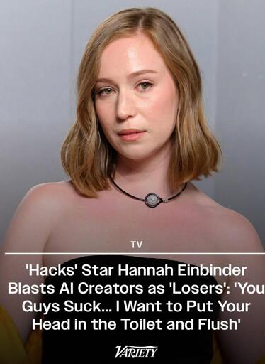 Here is her actual quote from a press conference yesterday promoting her show. “The people who make this stuff are losers. They’re not artists. They’re not creative,” she said at the “Hacks” press conference last month at the London hotel in West Hollywood. “And they’ve wanted their whole lives to be special. And they’re not special. So, they’re trying to rob real creative people of our gifts. And you can’t. And even if you try, you will never be cool. You guys suck. No one likes you. Anyone who’s near you is because they crave power and access over any ethical standard. You are a loser. You will never be cool. And you probably had a rolly backpack in high school. I wanna put your head in the toilet and flush.” full interview here. https://variety.com/2026/tv/news/hannah-einbinder-ai-creators-losers-1236706302/ submitted by /u/thegreatniteowl