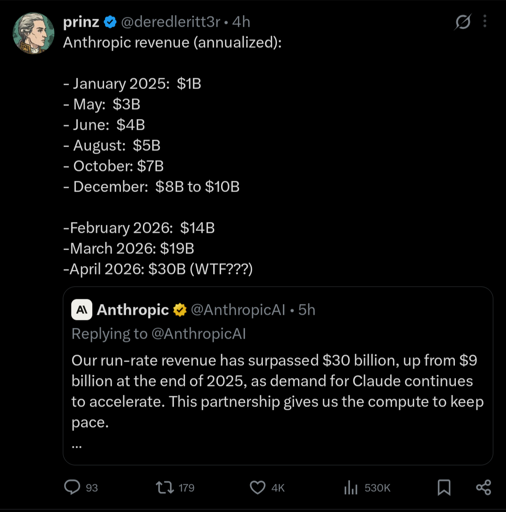 eifachposteMB to AI (Reddit RSS)English · 2 hours agoAnthropic revenue (annualized): April 2026 - $30Bi.redd.itimagemessage-square0linkfedilinkarrow-up11file-text