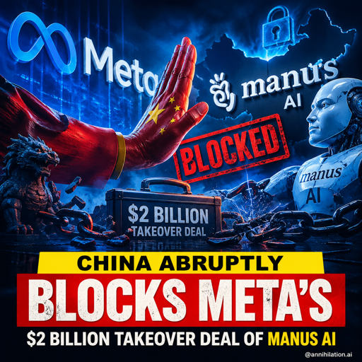 China has reportedly blocked Meta’s $2 billion takeover of Manus AI, ordering the deal to be unwound in a sharp reminder that the global AI race is not just about code — it is about control, strategy, and national power. Manus, which started in Beijing and later shifted to Singapore, became a major target because of its autonomous AI agent tech — the kind of software that can handle complex tasks with little human input. That is exactly why this deal mattered so much. The bigger story here is the tension behind it all: China is tightening scrutiny on foreign investment in critical tech, while Meta keeps pushing deeper into AI. This is not just a business headline. It is a sign that AI dominance is becoming a geopolitical battlefield. In plain terms: Meta wanted a bigger seat at the AI table, but Beijing just pulled the chair back. What do you think this means for the future of global AI deals — more blockades, more regulation, or a bigger tech split between East and West? Drop your take below and share this with someone following the AI race. 🔥 #MetaAI #ManusAI #AIGeopolitics #ChinaTech #AINews submitted by /u/PsychologicalCat937