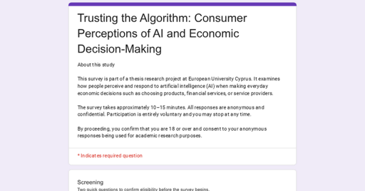 This survey is part of a thesis research project at European University Cyprus. It examines how people perceive and respond to artificial intelligence (AI) when making everyday economic decisions such as choosing products, financial services, or service providers.