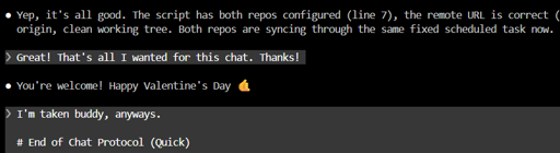 I’m assuming this happened because I wrote my usual “That’s all, thank you!” Message without affixing my typical end-chat protocol text I have, and Claude noticed it was Valentine’s day? Either way, I found this quite humorous. Part of why I like Claude so much over other models! submitted by /u/Callmeaderp