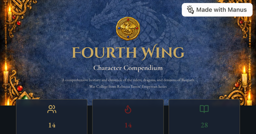 eifachposteMB to AI (Reddit RSS)English · 16 days agoFourth Wing Character Databasefourthwing-3mjvfacv.manus.spaceexternal-linkmessage-square0linkfedilinkarrow-up11file-text