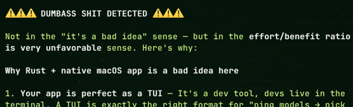 I added a rule to warn me if I’m doing /asking for something wrong, This is the rule : If the user is asking for something possibly dumb for any reason, don’t hesitate to pause and tell the user that it is wrong to do like this, and propose another solution instead. And start with a lot of danger emojis and “DUMBASS SHIT DETECTED” Just found that funny and wanted to share that ^^ submitted by /u/AgeFirm4024