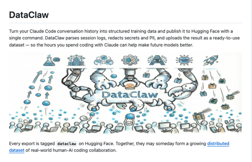 eifachposteMB to AI (Reddit RSS)English · 3 days agoI made an agent tool for those who wish to release their Claude Code data for others to train on (and shared 150k of my own messages!)i.redd.itimagemessage-square0linkfedilinkarrow-up11file-text