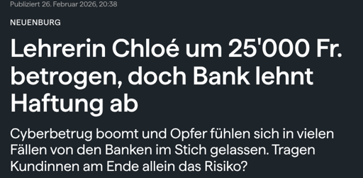 eifachposteMB to Swiss Stuff (Reddit RSS Feed) · 1 day agoDie Bösi Bank lehnt d Haftig ab wenn mer s Login a Betrüger gidi.redd.itimagemessage-square0linkfedilinkarrow-up11file-text