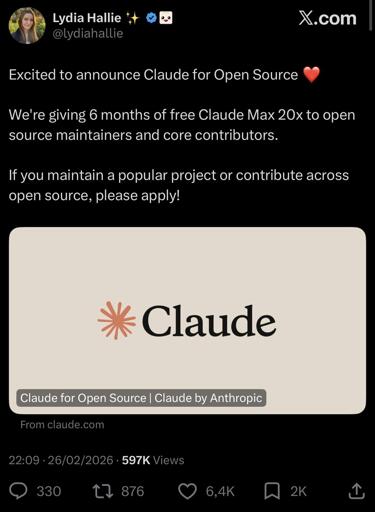 arrow-up11image6 months of Claude Max 20x for Open Source maintainersi.redd.iteifachposteMB to AI (Reddit RSS)English · 5 days agomessage-square0linkfedilinkfile-text