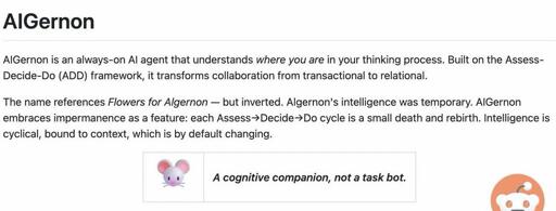 eifachposteMB to AI (Reddit RSS)English · 22 days agoIntroducing AIGernon - a cognitive companioni.redd.itimagemessage-square0linkfedilinkarrow-up11file-text